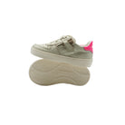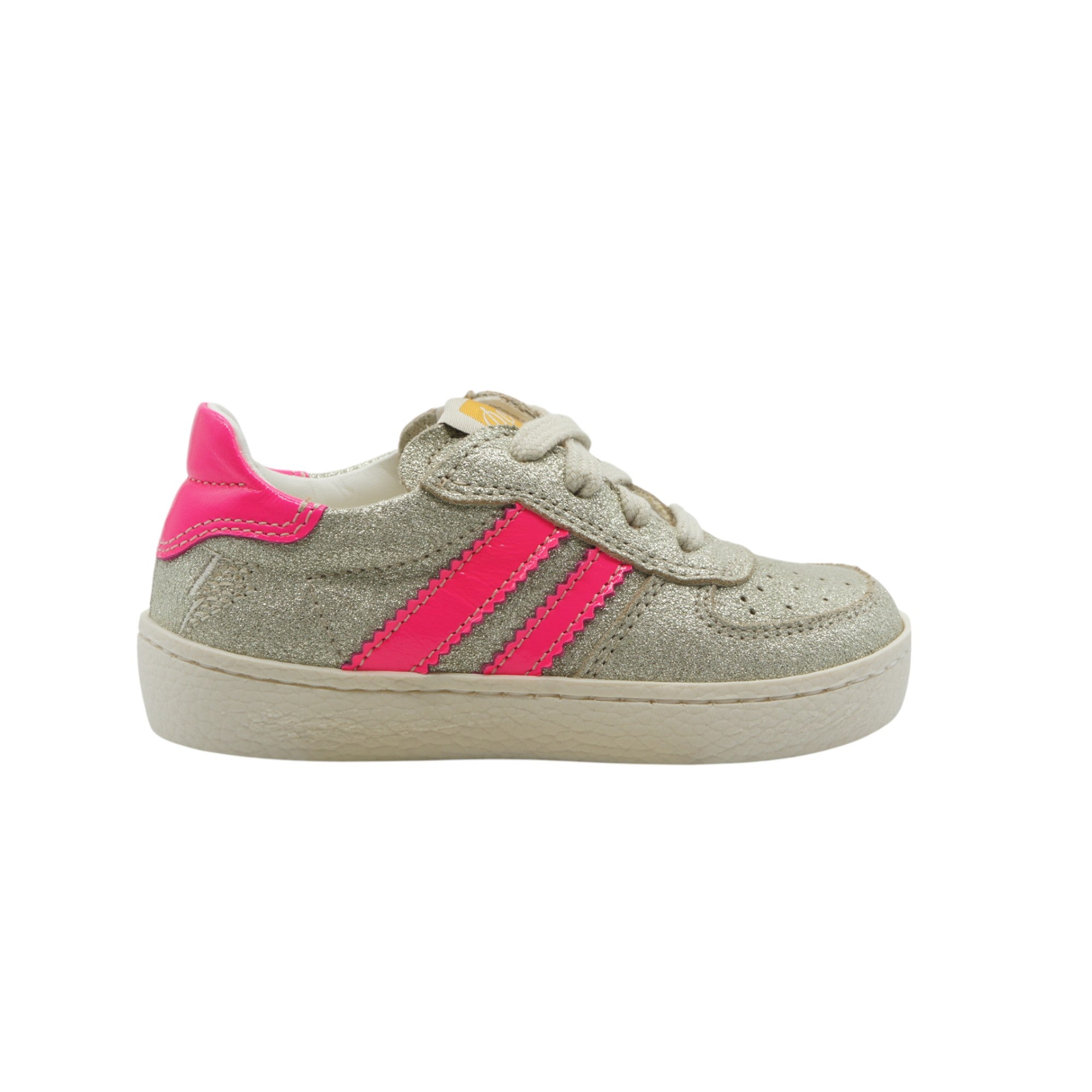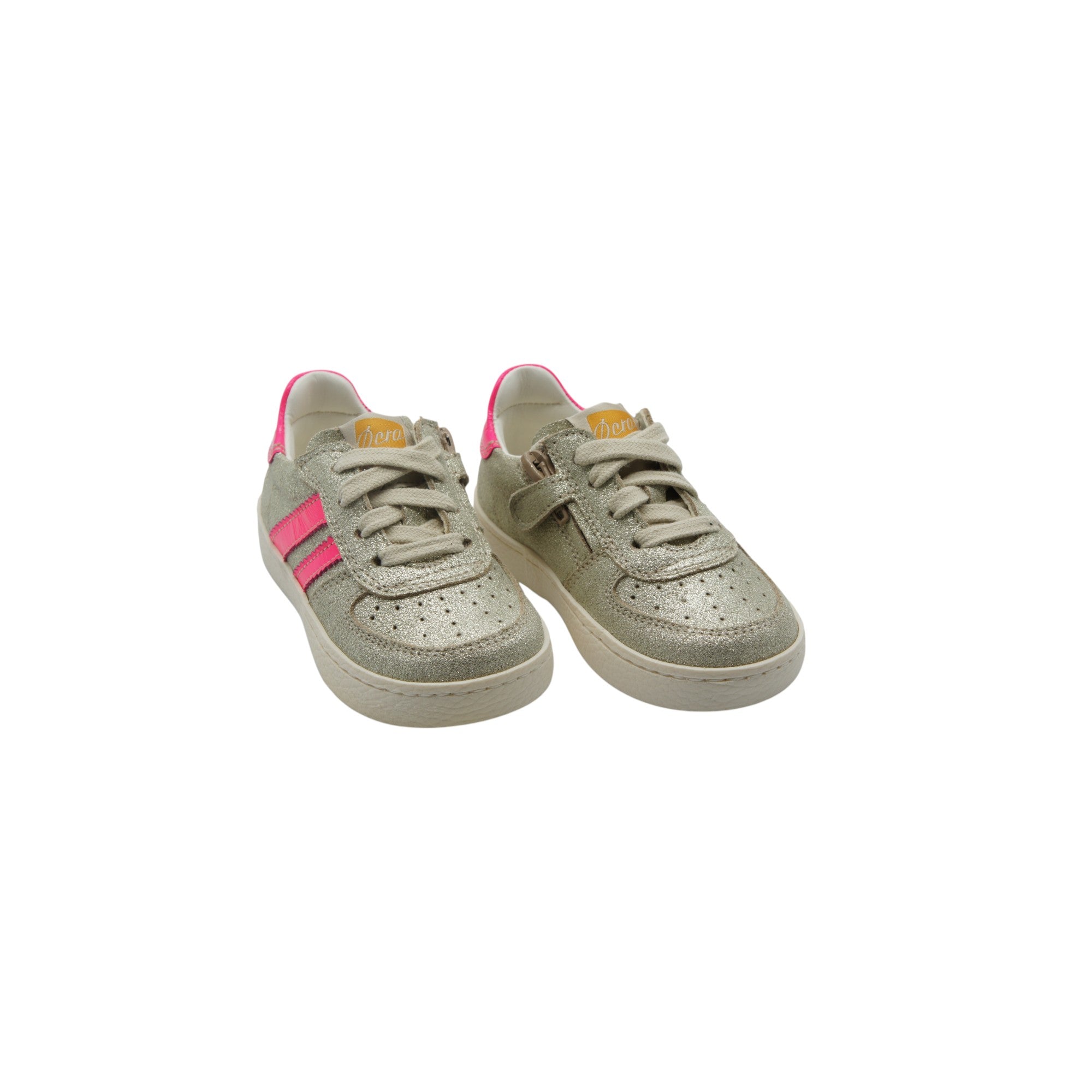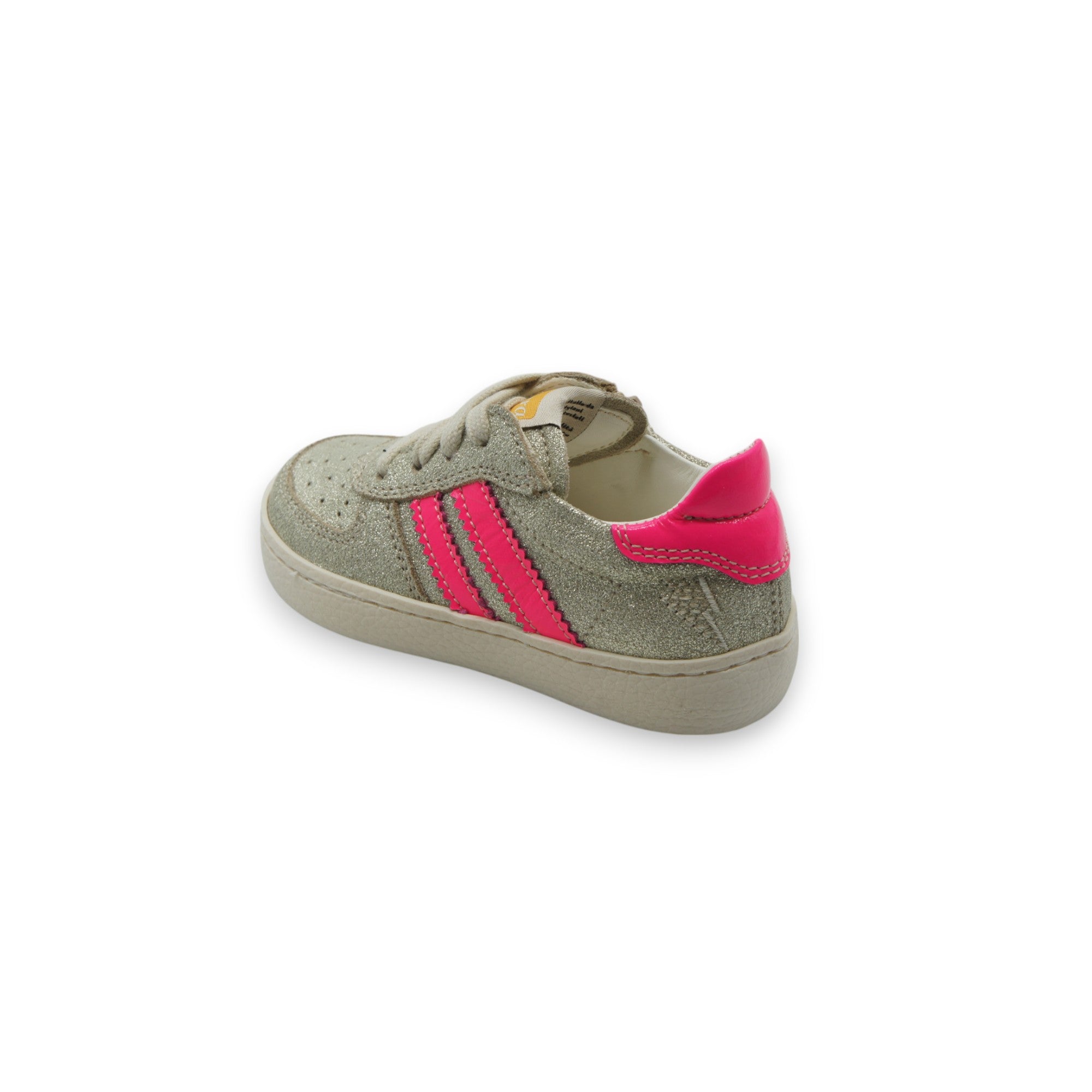Sneaker bassa stringata in suede glitterato con vivaci dettagli in pelle fluo, pensata per uno stile e un comfort quotidiano. Dotata di una pratica cerniera laterale per una facile calzata, una morbida fodera in vitello e una soletta interna rimovibile in vitello. Rifinita con una resistente suola in gomma per stabilità e flessibilità.
